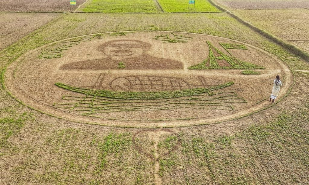 ময়মনসিংহের ঈশ্বরগঞ্জ উপজেলায় ফসলের মাঠে বঙ্গবন্ধু শেখ মুজিবুর রহমানের প্রতিকৃতি এঁকেছেন এক কৃষক। রবি শস্য দিয়ে আঁকা হয়েছে এই শিল্পকর্ম। এটি দেখতে বিভিন্ন এলাকা থেকে মানুষ ভিড় জমাচ্ছেন কৃষক আব্দল কাদিরের ক্ষেতে।