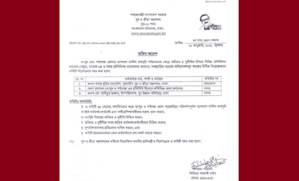 রংপুর ও গাইবান্ধায় ন্যাশনাল সার্ভিস কর্মসূচিতে অনিয়ম-দুর্নীতির অভিযোগ তদন্তে কমিটি গঠন করেছে যুব ও ক্রীড়া মন্ত্রণালয়।