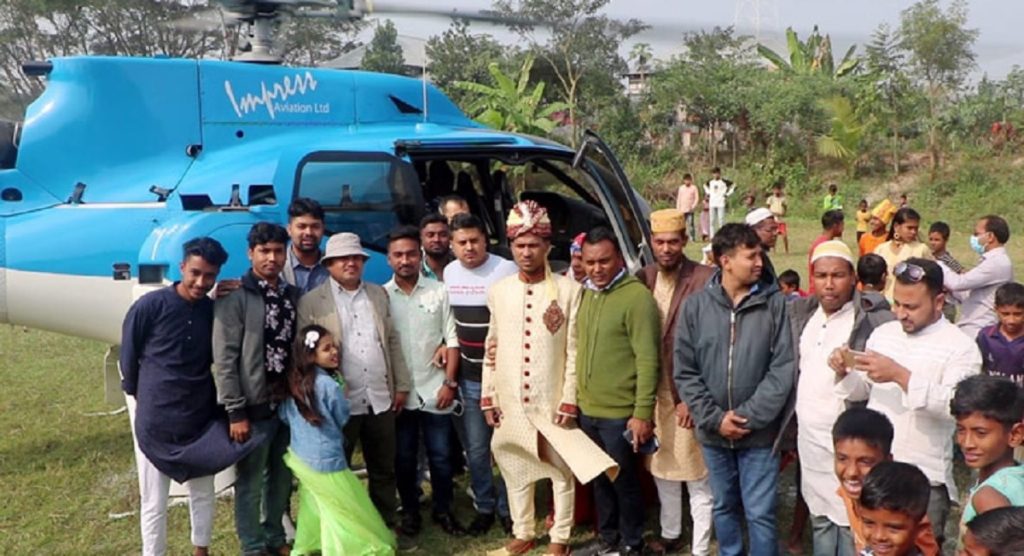 দাদার শখ ছিল নাতিকে হেলিকপ্টারে করে বিয়ে করানোর। দাদা এখন আর নেই। তাই শত কষ্ট হলেও হেলিকপ্টারে চড়ে বিয়ে করতে গেছেন ব্রাহ্মণবাড়িয়ার বাঞ্ছারামপুরের ফারুক হোসেন।