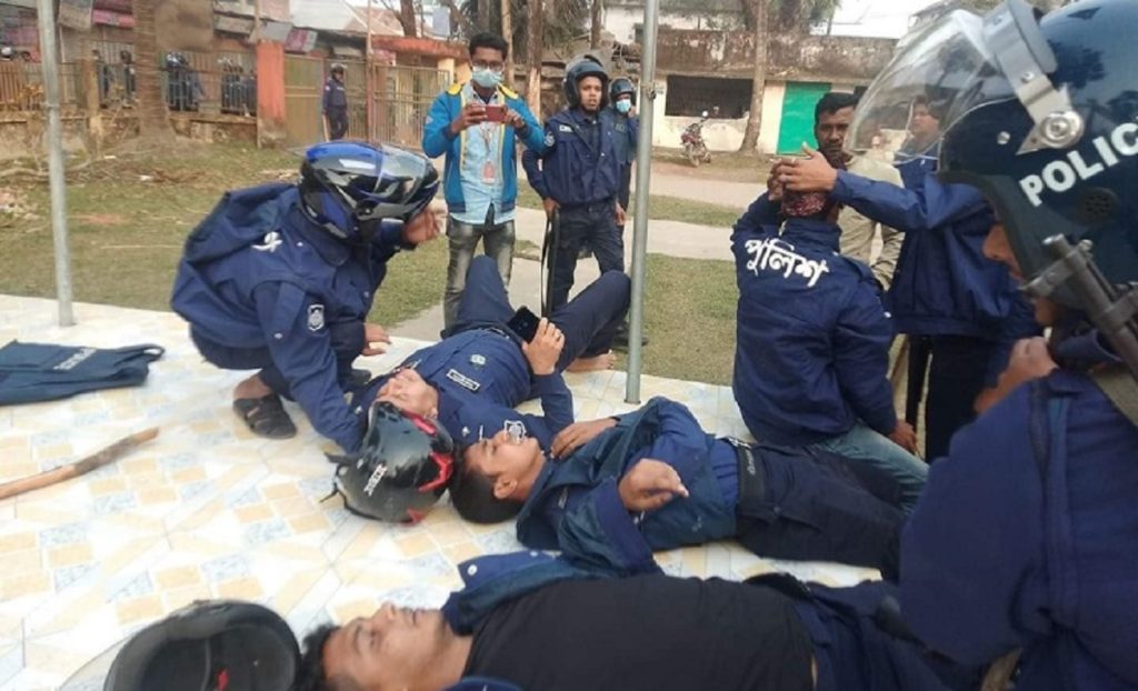 পাথরঘাটা সার্কেল তোফায়েল আহমেদ সরকার বলেন, চার শতাধিক নারী-পুরুষ সশস্ত্র অবস্থায় মিছিল করে থানা ঘেরাও করতে আসলে পুলিশ বাধা দেয়। অপরদিকে থানার বিপরীত দিকে পাথরঘাটা শেখ রাসেল স্কয়ারে আওয়ামী লীগের সমর্থনের লোকজন অবস্থান নেয়। এ সময় পুলিশ নিয়ন্ত্রণে আনতে ফাঁকা গুলি ছোড়ে। এ সময় স্বতন্ত্র প্রার্থীর লোকজনের হামলায় পাথরঘাটা থানার ওসি শাহাবুদ্দিনসহ ২০ জন পুলিশ সদস্য আহত হয়েছেন।