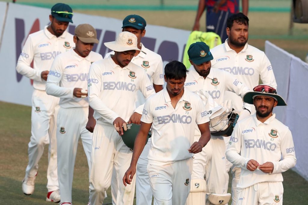 মিরাজ ১০৩, সাকিব ৬৮, সাদমান ৫৯, লিটন ৩৮, মুশফিক ৩৮, মুমিনুল ২৬, শান্ত ২৫, নাঈম ২৪, তামিম ৯;