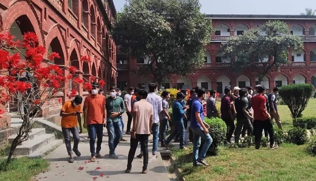 ঢাকা বিশ্ববিদ্যালয়ের হল খুলে দেয়ার দাবিতে সকাল ১১টার দিকে শহীদুল্লাহ হল কম্পাউন্ডে অবস্থান করছেন শিক্ষার্থীরা।