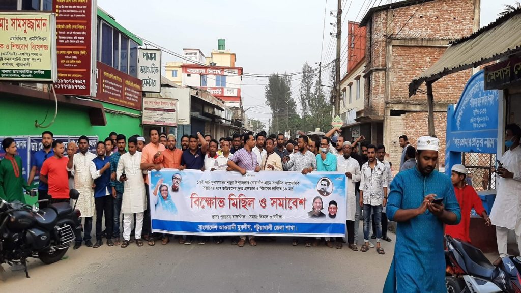 শুক্রবার (১৯ মার্চ) বিকাল ৫টার দিকে পটুয়াখালী পুরাতন বাসস্ট্যান্ড থেকে পটুয়াখালী জেলা যুবলীগের ব্যানারে বিক্ষোভ মিছিল বের করে সিএমবি কালভাট এলাকায় গিয়ে সংক্ষিপ্ত সমাবেশ করা হয়।