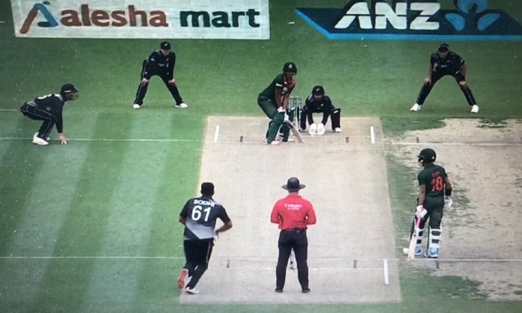 ৫৯ রানেই ৬ উইকেট পড়ে যায় বাংলাদেশের। দলীয় ১৬ রানের মাথায় প্রথম উইকেট হারায় বাংলাদেশ। রানের খাতা খোলার আগেই অধিনায়ক টিম সাউদির বলে ইশ শোধির হাতে ক্যাচ তুলে দেন ওপেনার লিটন দাস। এরপর বালির বাঁধের ন্যায় ভেসে যায় বাংলাদেশের টপ ও মিডল অর্ডার। ২৭ রানে ব্যাট করে সেট হয়ে যাওয়া ওপেনার নাঈমও ফারগুনের এলবিডব্লিউয়ের স্বীকার হন। এরপর মিঠুন নামলে তার সঙ্গে জুটি গড়তে পারেননি সৌম্য সরকার। স্পিনার ইশ শোধির ডেলিভারিতে ফিরতি ক্যাচ দিয়ে সাজঘরে ফেরেন সৌম্য। রান জমা করতে পারেন মাত্র ৫। এক বল খেলে এক রান নিয়ে মিঠুনকে স্ট্রাইক দেন অধিনায়ক মাহমুদউল্লাহ রিয়াদ। এটাই যেন কাল হলে দাঁড়ালো। ইশ শোধির জোড়া শিকারে পরিণত হন মিঠুন। শোধির গুগলিতে পরাস্ত হয়ে বোল্ড হয়ে যান তিনি। দলীয় সংগ্রহে ৪ রান যোগ করেই সাজঘরের পথে হাঁটেন মিঠুন। নিজের তৃতীয় ওভারে ফের বিধ্বংসী হয়ে ওঠেন ইশ শোধি।