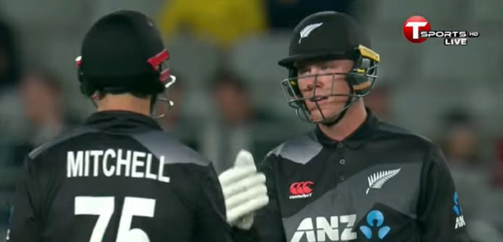 শরিফুলের বলে ৬ বলে ১৪ রান করে আউট হন ফিলিপস। মিসেল ১১ রানে হয়েছেন রান আউট। শেষ পর্যন্ত বৃষ্টির কারণে ম্যাচের পরিধী কমিয়ে আনায় নির্ধারিত ১০ ওভারে ১৪১ রান তোলে নিউজিল্যান্ড।