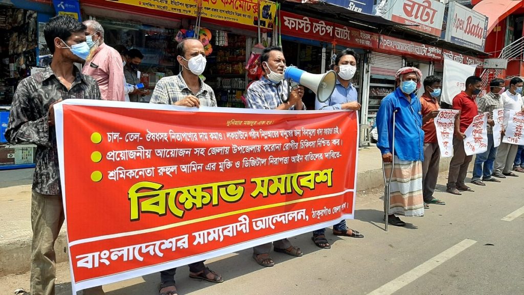 চাল, তেল ওষুধসহ নিত্যপণ্যের দাম কমানো, লকডাউনে গরীব নিন্মআয়ের মানুষের জন্য বিনামূল্যে খাদ্য সহায়তা ও শ্রমিকনেতা রুহুল আমিনের মুক্তি এবং ডিজিটাল নিরাপত্তা আইন বাতিলের দাবিতে ঠাকুরগাঁওয়ে মানববন্ধন অনুষ্ঠিত হয়েছে।