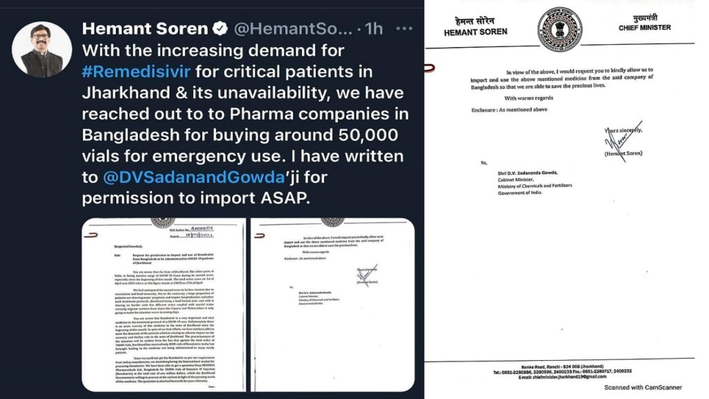চিঠিতে ঝাড়খণ্ড রাজ্য বাংলাদেশ থেকে করোনা চিকিৎসায় রেমডিসেভির এর ৫০ হাজার ভায়াল ইনজেকশন আমদানি করতে চায় বলে উল্লেখ করেছেন হেমন্ত।