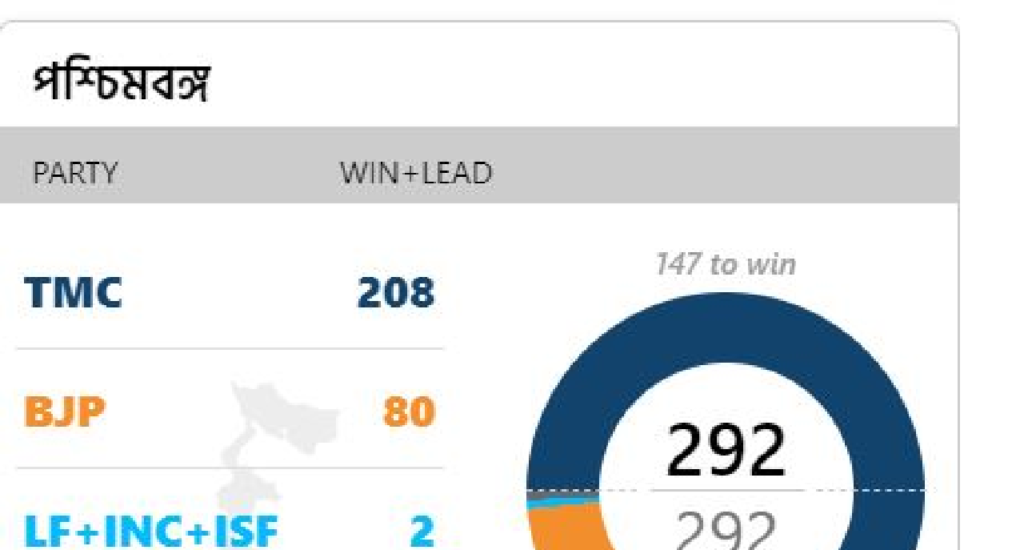 আজ (২ মে) পশ্চিমবঙ্গ বিধানসভা নির্বাচনের ফল ঘোষণা চলছে। পশ্চিমবঙ্গের সংবাদমাধ্যম এবিপি আনন্দ’র সর্বশেষ তথ্য অনুসারে, তৃণমূল কংগ্রেস এগিয়ে আছে ২০৮ টি আসনে, বিজেপি ৮০ টি আসনে এবং বাম-কংগ্রেস- ইন্ডিয়ান সেকুলার ফ্রন্টের সংযুক্ত মোর্চা এগিয়ে আছে মাত্র ২ টি আসনে।