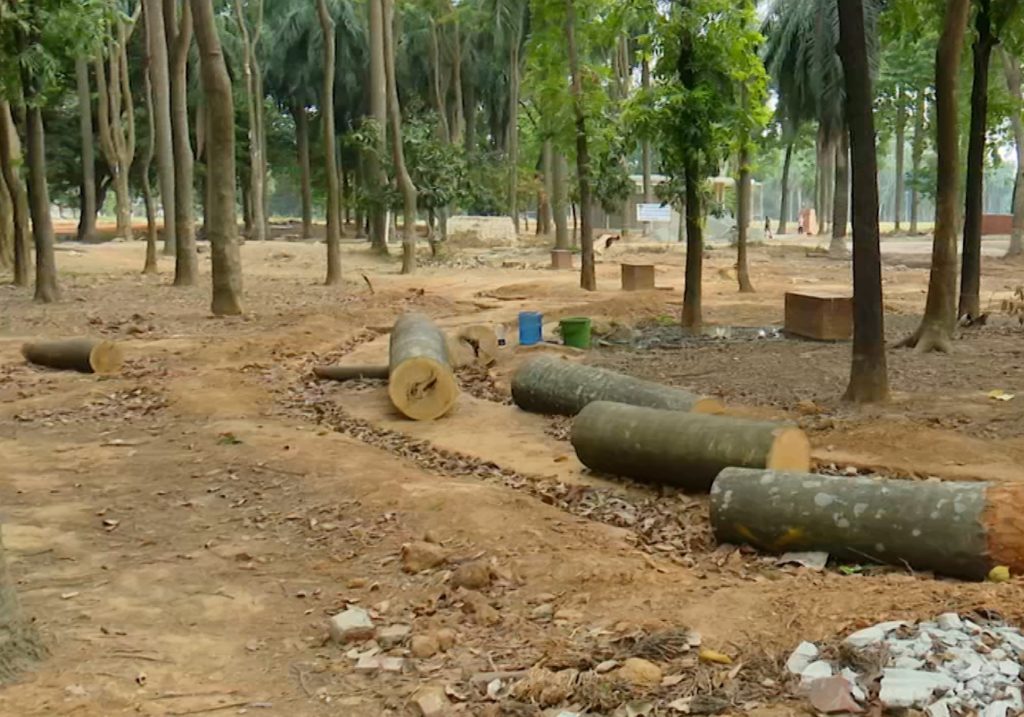 উদ্যান জুড়ে বিভিন্ন স্থাপনা নির্মাণ এই গাছ কাটার কারণ। এখানে সেখানে একতলা স্থাপনা নির্মাণ হচ্ছে। কোথাও ওয়াকওয়ে নির্মাণের জন্য মাটিকেটে রাখা হয়েছে।