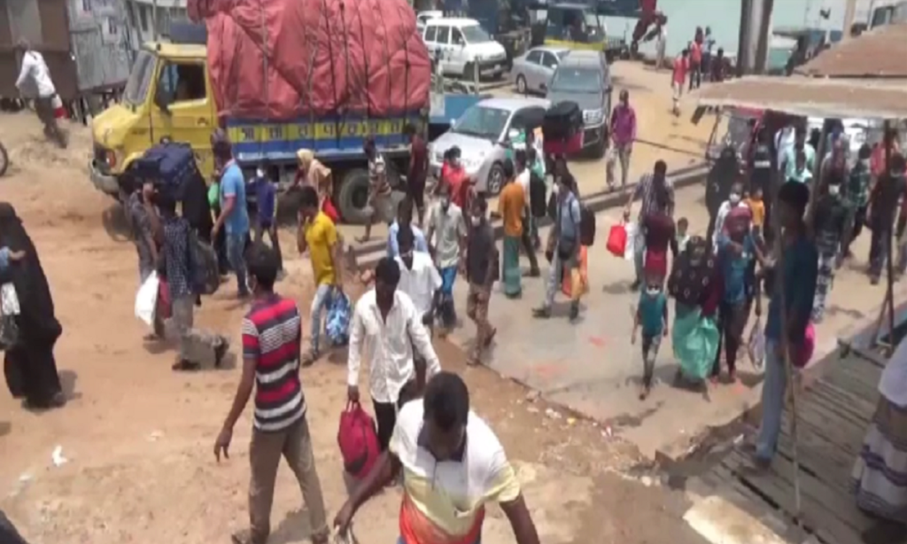 বুধবার দুপুরে ঘাট এলাকায় যাত্রীর এ চাপ দেখা যায়। তবে এ সময় সামাজিক দূরত্ব বা স্বাস্থ্যবিধি মানতে দেখা যায়নি যাত্রীদের। লকডাউনের সময়সীমা ঈদ পর্যন্ত বর্ধিত হওয়ায় অনেকে পরিবার পরিজন নিয়ে আগেই ঢাকা ছেড়ে বাড়িতে যাচ্ছেন।
