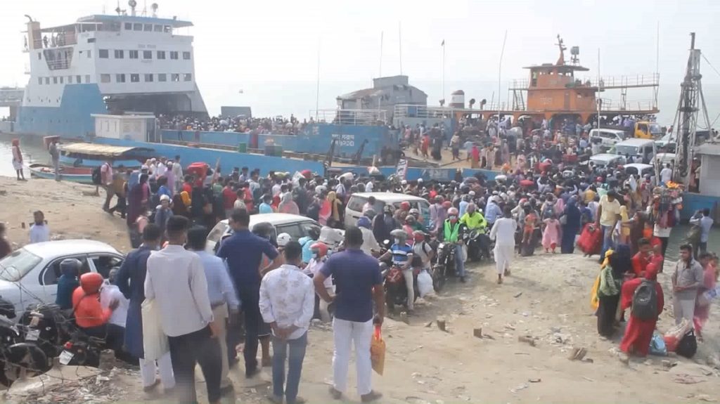 শনিবার ভোর থেকে ঈদের আগে বাড়ি ফিরতে না পারা যাত্রীদের ফেরিযোগে দক্ষিণবঙ্গে যেতে দেখা যায়। তবে সকাল ৯টা থেকে ঢাকামুখী মানুষের চাপ বাড়তে শুরু করে এ নৌরুটে। বেলা বাড়ার সাথে সাথে এ চাপ বাড়ছে।