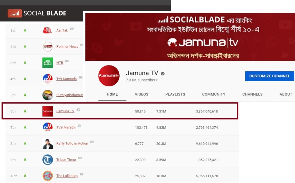 সোশ্যাল ব্লেডের তালিকায় সাবস্ক্রাইবারের পাশাপাশি চ্যানেলের কন্টেন্টের ভিউ, ফিডব্যাক ও সামগ্রিক প্রভাব বিবেচনা করা হয়। তাই তো বিশ্বের বুকে ৬ নম্বরে লাল সবুজের একটি চ্যানেলের এই অবস্থান আত্নবিশ্বাসী করছে যমুনা টিভিকে।