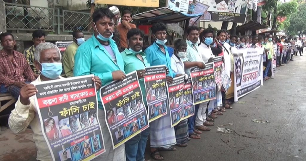 নরসিংদীর মাধবদীর আনন্দীতে স্বামী ও তার পরিবারের নির্যাতনে দুই সন্তানের জননী গৃহবধূ কল্পনা রানী বাসফোঁড় হত্যার বিচারের দাবিতে মানববন্ধন অনুষ্ঠিত হয়েছে।