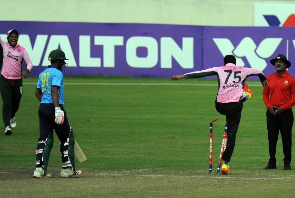 মিরপুরে আবাহনী মোহামেডানের মধ্যকার ঢাকা ডার্বিতে মুশফিকুর রহিমের বিরুদ্ধে সাকিব লেগ বিফোরের আবেদন করলে আম্পায়ার ইমরান পারভেজ তা আমলে নেননি। ক্ষুদ্ধ সাকিব মেজাজ হারিয়ে স্টাম্পে লাথি মেরে বসেন। এরপর বৃষ্টির শঙ্কায় আম্পায়ার খেলা বন্ধের সিদ্ধান্ত নিলে তার প্রতিবাদে আম্পায়ার মাহফুজুর রহমান লিটুর সামনে থাকা স্ট্যাম্প উপড়ে, মাটিতে আছড়ে ফেলেন ক্ষুদ্ধ সাকিব।