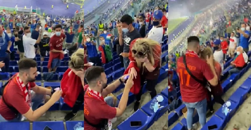 তুরস্কের এক যুবক নিজের ভালোবাসা প্রকাশ করার জন্য বেছে নিয়েছে এবারের ইউরোর মঞ্চকে। প্রেমিকাকে সঙ্গে নিয়ে রোমের এস্তাদিও অলিম্পিকোতে খেলা দেখতে এসেছিলেন তিনি। সুযোগ বুঝে খেলার ফাকেই নিজের প্রেমিকাকে হাঁটু গেড়ে বসে আংটি নিয়ে বিয়ের প্রস্তাব দেন ওই তরুণ। তাকে অপেক্ষা না করিয়ে মেয়েটিও বিয়ের প্রস্তাবে রাজি হয়ে যায়। রাতারাতি সামাজিক যোগাযোগ মাধ্যমে ভাইরাল হয় তাদের ভিডিও।
