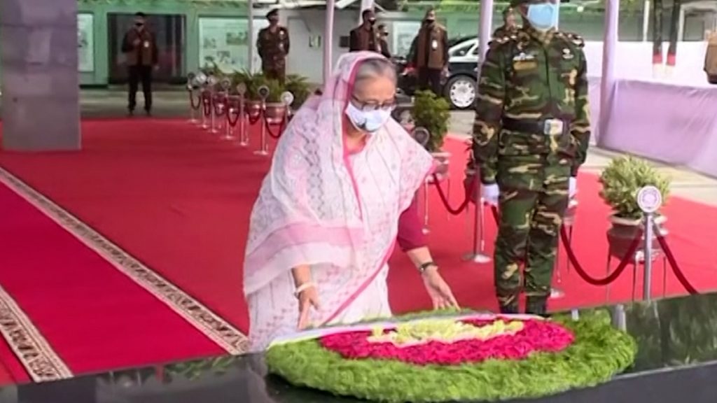 উপমহাদেশের ঐতিহ্যবাহী রাজনৈতিক দল বাংলাদেশ আওয়ামী লীগের ৭২তম প্রতিষ্ঠাবার্ষিকীতে ধানমণ্ডিতে শ্রদ্ধা নিবেদন করেন বঙ্গবন্ধু কন্যা। এরপর কিছুক্ষণ নীরবে দাঁড়িয়ে থাকেন তিনি। মহামারির পরিস্থিতিতে সীমিত পরিসরে জাতির পিতার প্রতি শ্রদ্ধা জানান আওয়ামী লীগ সভানেত্রী।