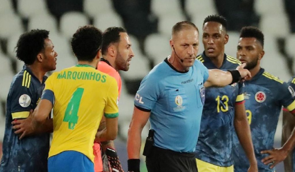 ম্যাচের ৭৮ মিনিটে কলম্বিয়ার ডি-বক্সের ১০ মিটার দূরে নেইমারের পাস গিয়ে রেফারির গায়ে লাগে এবং ফিরে আসা বলে করা ক্রস পরিণত হয় ব্রাজিলের সমতাসূচক গোলে। ম্যাচ শেষে রেফারির সমালোচনা করেন কলম্বিয়ার কুয়াদ্রাদো।