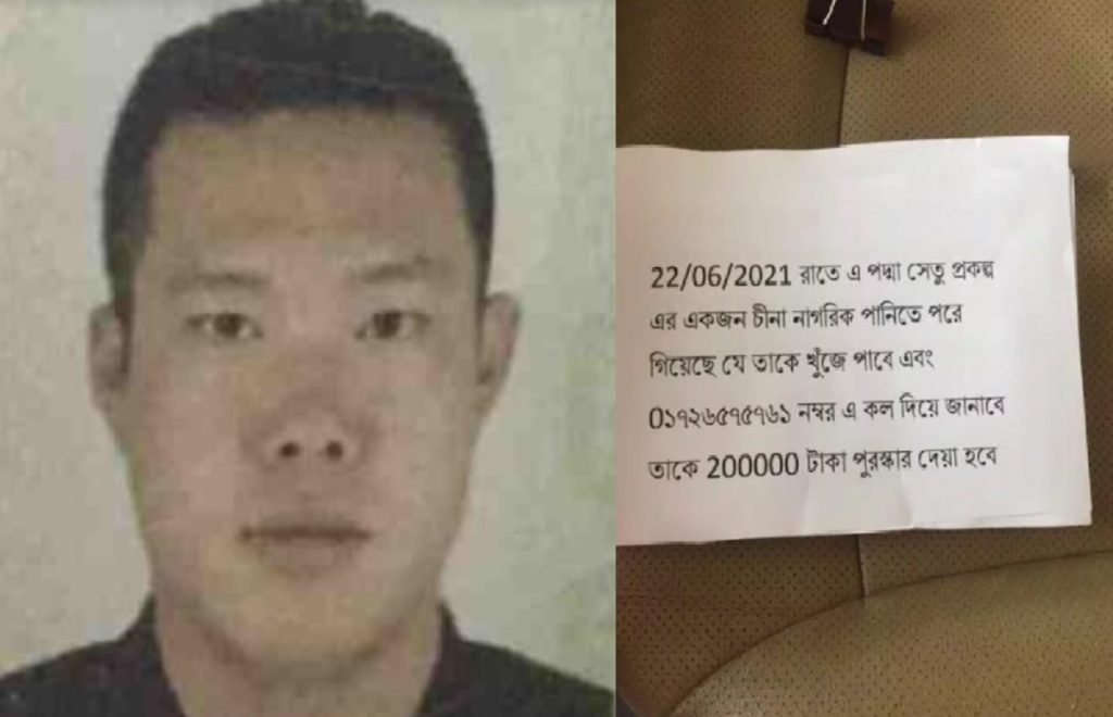 প্রসঙ্গত, লৌহজং উপজেলার শিমুলিয়া তিন নম্বর ফেরিঘাট বরাবর মাঝ নদীতে পদ্মা বহুমুখী সেতু প্রকল্পের বৈদ্যুতিক টাওয়ার নির্মাণ কাজে নিয়োজিত ছিলেন জিয়াং। সেখানে কর্মরত অবস্থায় গত মঙ্গলবার (২২ জুন) রাত সাড়ে ৮টা থেকে নিখোঁজ রয়েছেন তিনি। এরপর থেকে তাকে খুঁজতে নদীতে তল্লাশি অভিযান চালাচ্ছে মাওয়া কোস্টগার্ড, ফায়ার সার্ভিস ও নৌ-পুলিশ।
