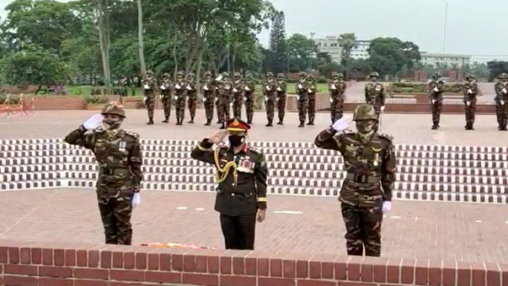 পুষ্পস্তবক অর্পণ শেষে তিনি বীর শহিদদের সম্মানে সালাম প্রদর্শন করেন। এ সময় শহিদদের স্মরণে বিউগলে করুণ সুর বাজানো হয় এবং সেনাবাহিনীর একটি চৌকস দল গার্ড অব অনার প্রদান করে।