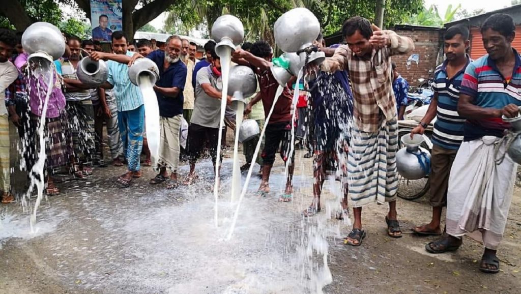 বাহাদুরপুর পুরানপাড়ার খামারি আবু বক্কর সিদ্দিক জানান, ‘দুধের ন্যায্য দাম পাচ্ছি না। এই দুধ লিয়্যা আমরা কি করবো? তাই মনের দুখখে দুধ ঠাইল্যে ফেল্যাই দিছি।’