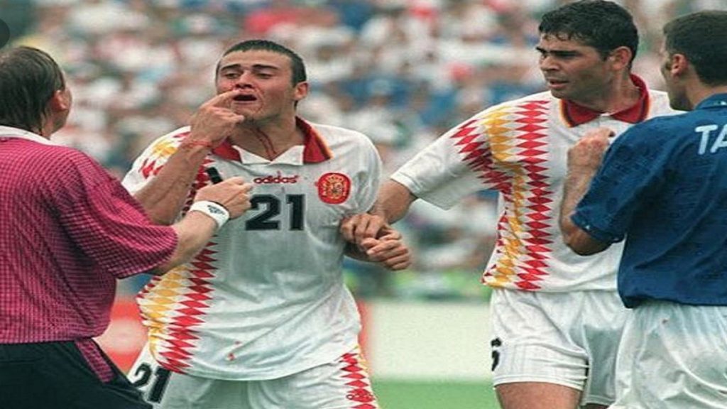 ১৯৯৪ সালে যুক্তরাষ্ট্র বিশ্বকাপের কোয়ার্টার ফাইনালে মুখোমুখি হয় স্পেন আর ইতালি। ওই ম্যাচে রবার্তো বাজ্জিওর ইতালির বিপক্ষে ২-১ গোলে হেরে গিয়েছিল স্পেন। শুধু হারের কারণেই নয়, ওই ম্যাচটি বর্তমান স্পেন কোচ লুইস এনরিকে মনে রেখেছেন রক্তাক্ত হয়ে নাক ভাঙার কারণে। ইতালির ফুটবলার মাউরো তাসোত্তির সঙ্গে সেদিন মাঠে ভয়াবহ সংঘর্ষ হয়েছিল আজকের স্পেন কোচের।