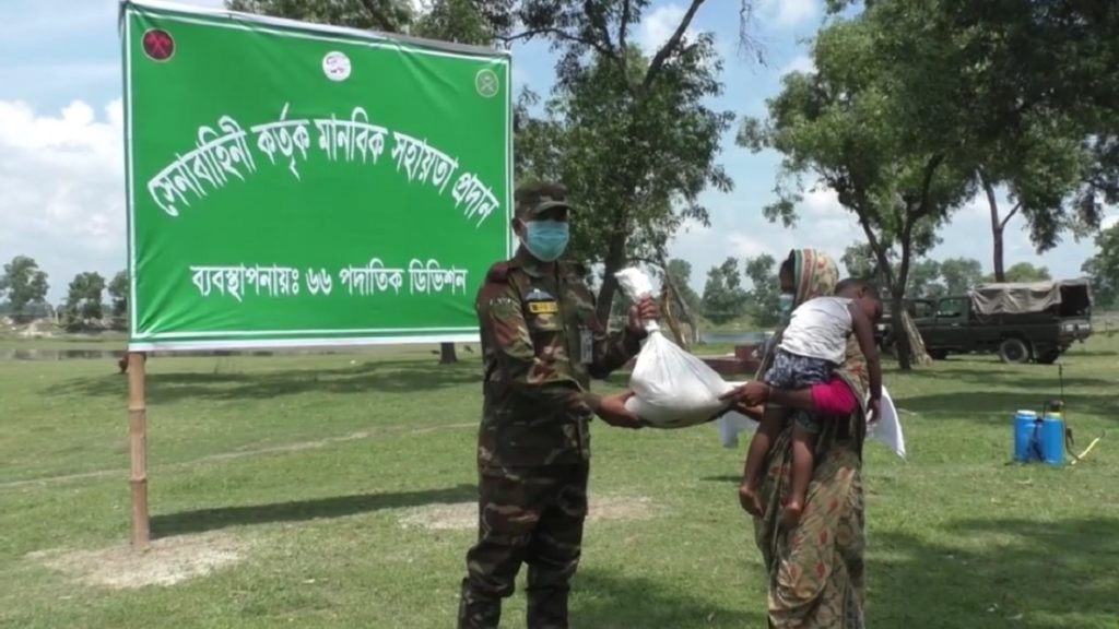 কুড়িগ্রামে চলমান লকডাউন পরিস্থিতিতে নিজেদের রেশন বিতরণ করে শতাধিক দুঃস্থ ও কর্মহীন মানুষকে খাদ্য সহায়তা দিয়েছে সেনাবাহিনী। শুক্রবার সকাল সাড়ে ১০টায় কুড়িগ্রাম ধরলা ব্রীজ সংলগ্ন শেখ রাসেল শিশু পার্কে রংপুর ৭২ পদাতিক বিগ্রেডের অন্তর্গত ৩০ বীর ব্যাটালিয়ন এই ত্রাণ বিতরণ কার্যক্রম পরিচালনা করে।