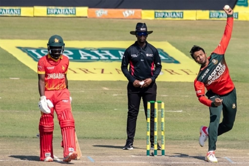 বোলিংয়ে এসে নিজের প্রথম ওভারেই উইকেট তুলে নেন সাকিব। ভালোই খেলতে থাকা চাকাভাকে তুলে নেন সাকিব। সাকিবের বলে শরীফুল ইসলামকে ক্যাচ দিয়ে ফেরেন তিনি। ৯ বলে ১৪ রান করে ফিরে গেছেন চাকাভা। এরপর দলের হাল ধরেন ওয়েসলে মাধেভেরে। দেখেশুনে ব্যাট করে ইনিংসের ১৪তম ওভারে নিজের টি-টোয়েন্টি ক্যারিয়ারের তৃতীয় ফিফটি তুলে নেন মাধেভেরে। তিনি করেন ৫৭ বলে ৭৩ রান। আর ডিওন মেয়ার্স করেছেন ২৬ রান।