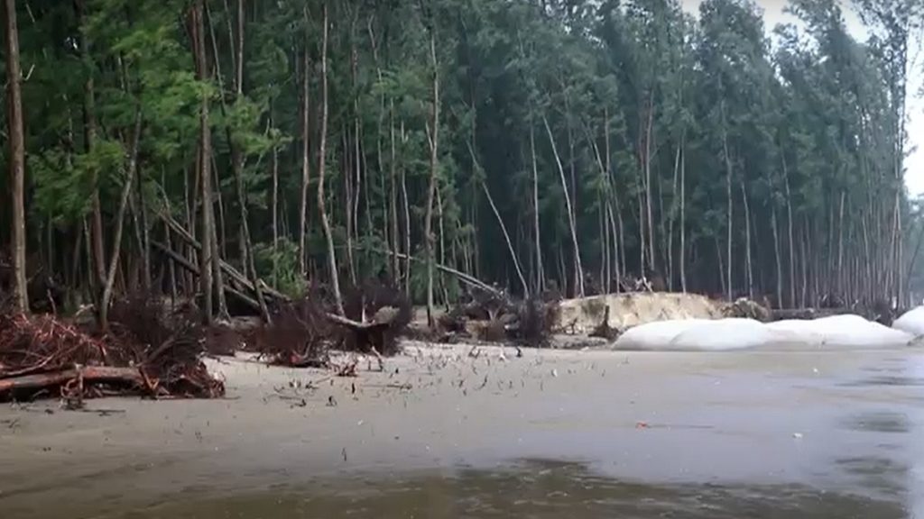 প্রচণ্ড জোয়ারের পানির আঘাতে উপড়ে পড়ছে একের পর এক ঝাউগাছ। এছাড়া জোয়ারের আঘাতে ভেঙ্গে পড়েছে কক্সবাজার হিমছড়ির পরিত্যক্ত মাধবী রেস্টহাউসটি।