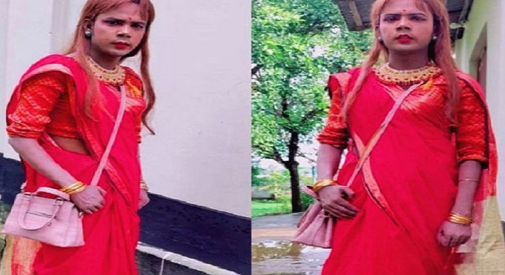 ছবিতে হিরো আলমকে দেখা যাচ্ছে- কপালে লাল টিপ, ঠোঁটে লাল লিপস্টিক দিয়েছেন তিনি। আর গায়ে জড়িয়েছেন টকটকে লাল শাড়ি এবং কাঁধে লেডিস ব্যাগ নিয়ে নারীর মতন দাঁড়িয়ে আছেন।
