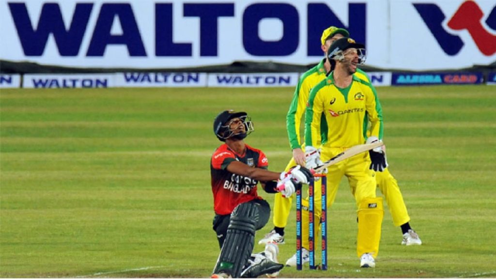 নাঈম প্যাভিলিয়নে ফেরার ৩ রান পর মাঠ ছাড়েন সাকিব আল হাসানও। আবারও মন্থর ইনিংস খেলে ২০ বলে করেন ১১ রান। জাম্পার বলে লেগ সাইডে খেলতে গিয়ে বল ব্যাট মিস করে লেগে যায় সামনের পায়ে। সাথে সাথেই জাম্পার জোরালো আবেদন, কিছুটা সময় নিয়ে আঙ্গুল তুলেন আম্পায়ার। এতেই ৬০ রানে ৩ উইকেট হারিয়ে বিপাকে পড়ে বাংলাদেশ।