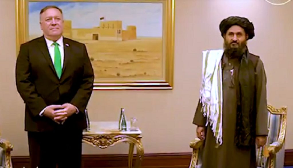 মাইক পম্পেও'র সাথে তালেবানের শীর্ষ নেতা আব্দুল ঘনি বারাদার।
