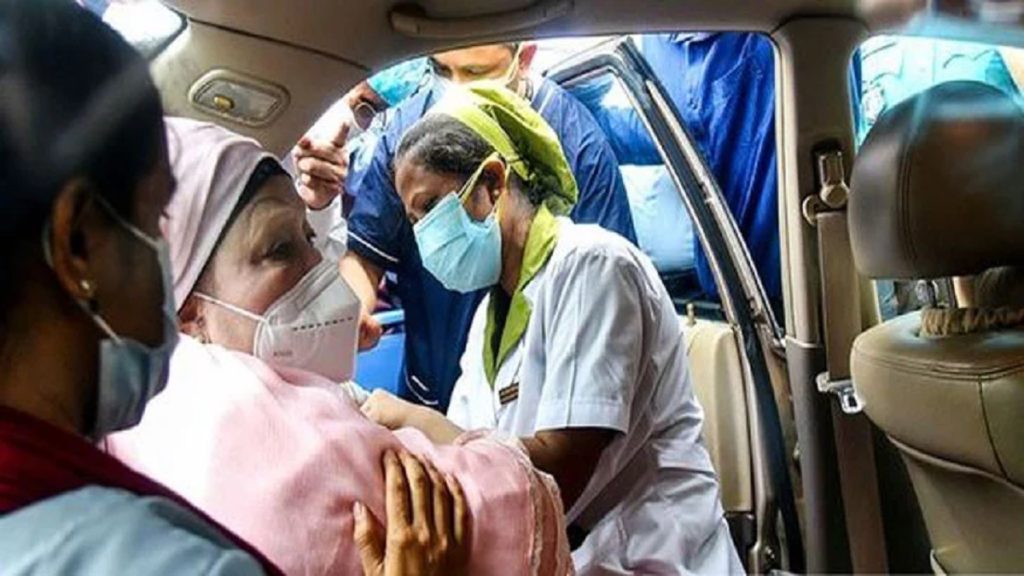 বিকাল ৪টার দিকে গুলশানের বাসা থেকে টিকা নিতে মহাখালীর গ্যাস্ট্রোলিভার হাসপাতালে যান বিএনপি চেয়ারপারসন। সেখানে নেতাকর্মীরা খালেদা জিয়াকে ঘিরে রাখেন। গাড়িতে বসেই টিকা নিয়েছেন তিনি।