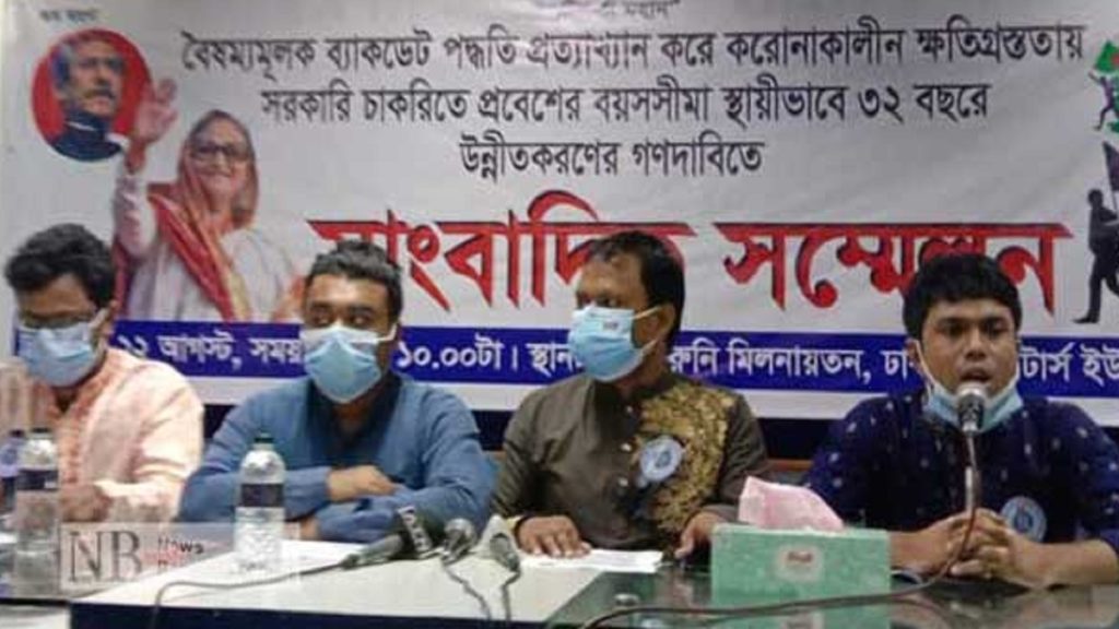 রোববার (২২ আগস্ট) ঢাকা রিপোর্টার্স ইউনিটিতে আয়োজিত এক সংবাদ সম্মেলনে তারা এই দাবি জানান। বক্তারা বলেন, দেশে করোনাভাইরাস সংক্রমণের কারণে দুই বছর ধরে প্রায় সব ধরনের চাকরির নিয়োগ পরীক্ষাও স্থগিত রয়েছে। করোনার মধ্যে চাকরিতে যোগদানের জন্য অস্থায়ীভাবে ২১ মাস সময় বাড়ানো হলেও নির্ধারিত কিছু ব্যক্তি এ সুবিধা পাবেন। অন্যরা চরমভাবে ক্ষতিগ্রস্ত হবেন। বৈষম্যমূলক এ পদ্ধতি প্রত্যাখ্যান করে বয়সসীমা স্থায়ীভাবে ৩২ বছরে উন্নীত করার দাবি জানান তারা।