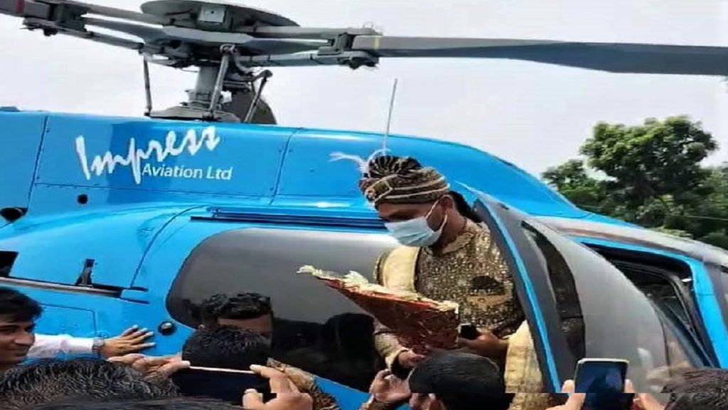 বর শিক্ষাথী, কনেও শিক্ষার্থী। বিশ্ববিদ্যালয় জীবনেই দুইজনের পরিচয়। এর মধ্যে প্রেম, তারপর পরিণয়। পারিবারিকভাবে বিয়ের সব আয়োজনও সম্পন্ন। বরের ইচ্ছা প্রেয়সীকে বিয়ে করে আনবেন হেলিকপ্টারে চড়িয়ে। যেমন ভাবনা তেমন কাজ, হেলিকপ্টারে চড়েই বর গেলেন কনের বাড়ি।