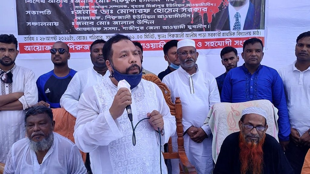 শনিবার (২৮ আগস্ট) সকাল ১১টায় সদর উপজেলার পিরুজালী ইউনিয়নের আলিম পাড়া সরকারি প্রাথমিক বিদ্যালয় স্কুল মাঠে এই আলোচনা সভা ও মিলাদ মাহফিল আয়োজন করা হয়। উক্ত অনুষ্ঠানে গাজীপুর জেলা আওয়ামী যুবলীগের আহ্বায়ক সদস্য জালাল উদ্দিন এর সঞ্চালনায়, পিরুজালী ইউনিয়ন আওয়ামী লীগের আহ্বায়ক মোশারফ হোসেন সরকার এর সভাপতিত্বে প্রধান অথিতি হিসেবে উপস্থিত ছিলেন গাজীপুর জেলা আওয়ামী লীগের যুগ্ম-সাধারণ সম্পাদক এড.জামিল হাসান দুর্জয়, বিশেষ অতিথি হিসেবে আলোচনা করেন বৃহত্তর মির্জাপুর ইউনিয়ন আওয়ামী লীগের সাবেক সাধারণ সম্পাদক শফিকুল ইসলাম শফি।