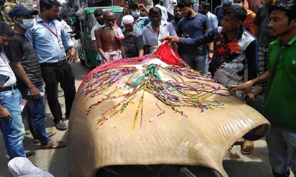 বরিশালে জেলের জালে ধরা পড়েছে ৫২২ কেজি (প্রায় ১৩ মণ) ওজনের শাপলাপাতা মাছ। এখন মাছটি বিক্রির জন্য মাইকিং করা হচ্ছে নগরীর পোর্টরোড এলাকায়।