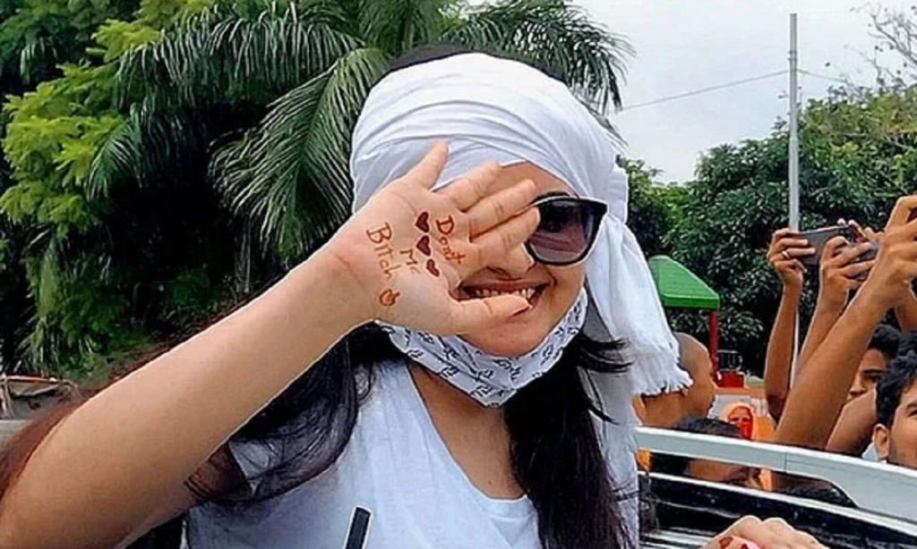 চিত্রনায়িকা পরীমণি জামিনে কারামুক্ত হয়েছেন আজ। কাশিমপুরের মহিলা কারাগার থেকে বের হয়ে যখন গাড়িতে উঠছিলেন, তখন হাত নেড়ে ও সেলফি তুলে উল্লাস করেন। পরীমণির হাতে মেহেদি দিয়ে লেখা ছিল ‘ডোন্ট লাভ মি বিচ’। তবে এই লেখা নিয়ে অনেকের মনে প্রশ্ন দেখা দেয়। কেন, কাদের ইঙ্গিত করে পরীমণি এ কথা লিখেছেন।