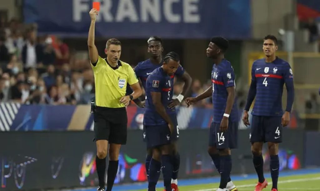 কিন্তু দ্বিতীয়ার্ধে বড় ধাক্কা খায় ফ্রান্স। লাল কার্ড দেখে ডিফেন্ডার জুলে কুন্দ মাঠ ছাড়লে ১০ জনের দলে পরিণত হয় দেশমের দল। এরপর বলের দখল রাখায় আধিপত্য দেখালেও শেষ পর্যন্ত আর গোল না হওয়ায় ১-১ গোলের ড্র নিয়ে স্ট্রাসবুর্গের লা মেইনাউ স্টেডিয়াম ত্যাগ করে ফ্রান্স।