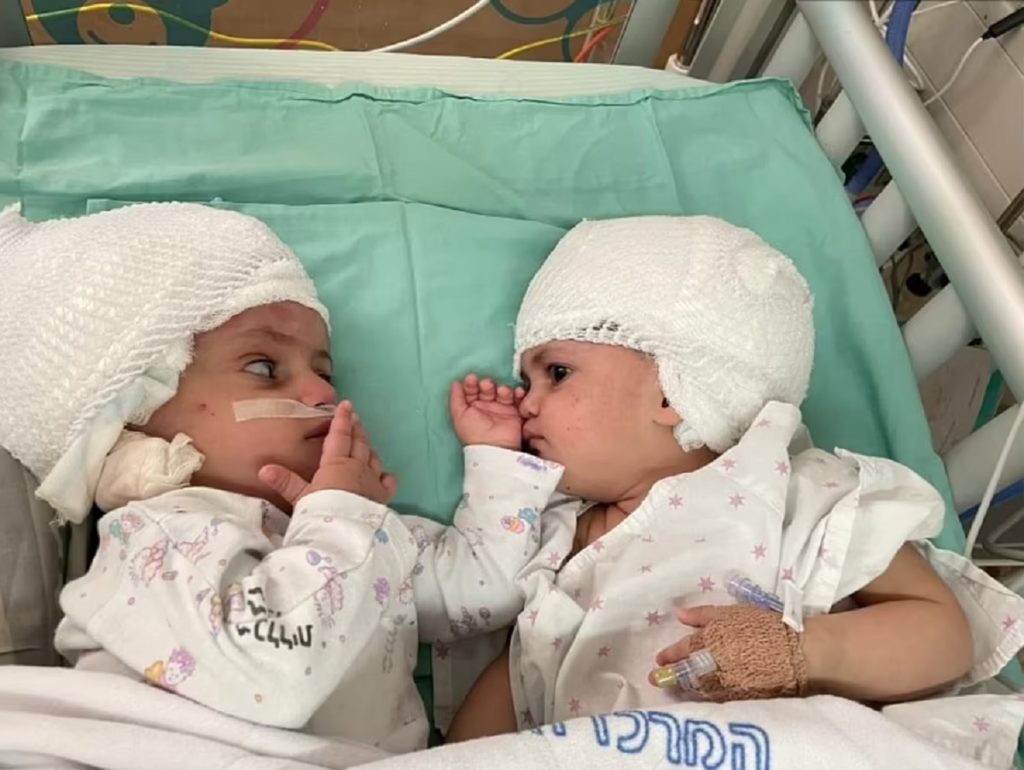 ২০২০ সালের আগস্টে ইসরায়েলে জন্মগ্রহণ করে দুই যমজ শিশু। জন্মের সময় তাদের মাথার পেছনের অংশ জোড়া দেয়া ছিলো, মুখ ছিল বিপরীত দিকে ঘোরানো। অবশেষে ১২ ঘণ্টার এক জটিল অস্ত্রপচারের মাধ্যমে আলাদা করা গেছে তাদের। খবর ডেইলি মেইলের।