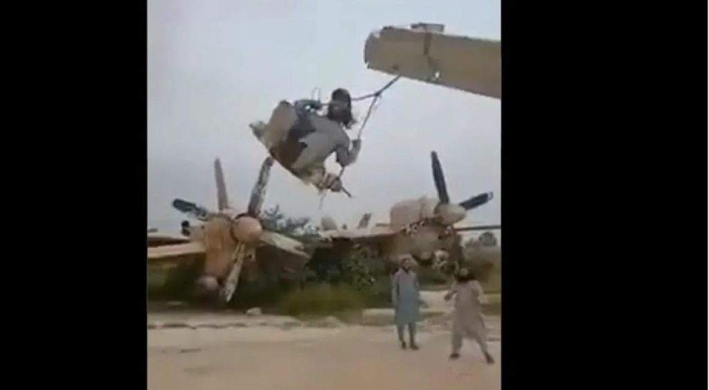 বিশাল এক যুদ্ধবিমানের পাখায় দড়ি ঝুলিয়ে মনের আনন্দে দোল খাচ্ছে তালেবানের এক সদস্য। পেছন থেকে তাকে দোল দিচ্ছে অন্য একজন। আশপাশে দাঁড়িয়ে থাকা অন্য সদস্যরাও আনন্দে মাতোয়ারা। সম্প্রতি তালেবানের এমনই এক ভিডিও ভাইরাল হয়েছে সামাজিক যোগাযোগ মাধ্যমে।
