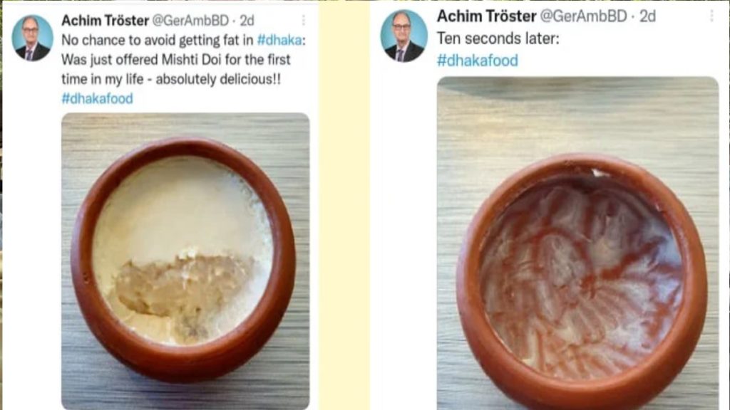 মাসখানেক আগে ঢাকায় জার্মান দূতাবাসে রাষ্ট্রদূত হিসেবে নিযুক্ত হয়েছেন আখিম ট্র্যোস্টার। তিনি ইতিমধ্যে ঢাকার মিষ্টি দই খেয়ে মুগ্ধ হয়েছেন তিনি।