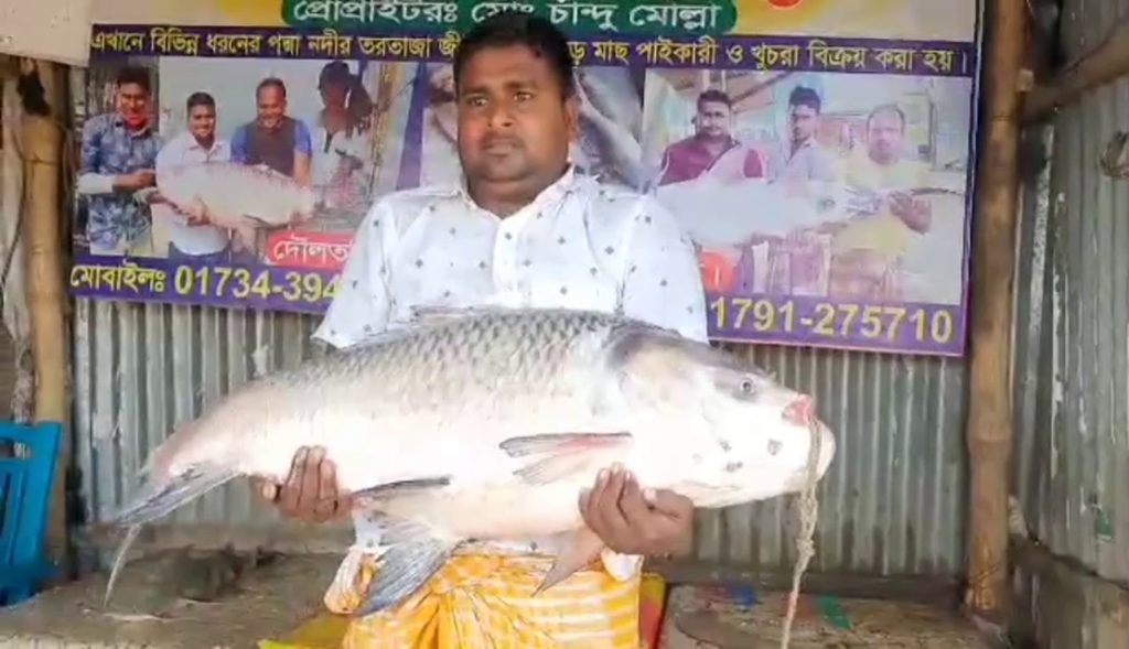 শনিবার (১৮ সেপ্টেম্বর) ভোররাতে দৌলতদিয়ার ৬ নম্বর ফেরি ঘাট এলাকার পদ্মা নদীতে গুরু দেব হলদার নামে এক জেলের জালে ধরা পড়ে বিশাল আকৃতির মাছটি। ওজন ১৮ কেজি ২শ গ্রাম।