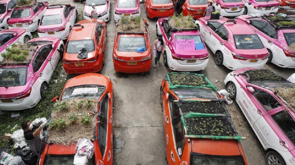 কাজ হারানো ট্যাক্সিচালকের সংখ্যা দিনের পর দিন বেড়েই চলেছে। এ সমস্যায় অভিনব এক প্রতিবাদ করেছে থাইল্যান্ডের ট্যাক্সিচালক ইউনিয়ন। ট্যাক্সির ছাদে বাগান করে সবজি ফলাচ্ছেন তারা।