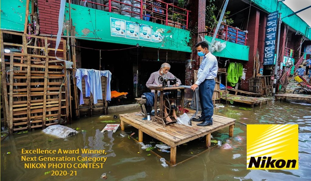 ছবির পেছনে গল্প জানান শাহরিয়ার আমিন ফাহিম। বলেন, কোভিড-১৯ এর পরবর্তীতে পুরো সময়টাই কেবল কেটেছে মানুষের বিয়োগাত্মক ঘটনা জেনে ও শুনে। প্রথম থেকেই আমি ফটোগ্রাফার হিসেবে উদ্যমী, কারণ এটা আমার ভালো লাগা। তাই ঝুঁকি নিয়ে হলেও আমি করোনার শুরুর পর থেকেই সব ধরনের স্ট্রিট ডকুমেন্টারির কাজ এগিয়ে নিয়েছি। বিশেষ করে এই ছবিটি একজন একনিষ্ঠ এবং সাহসী দর্জির ঘটনা বর্ণনা করে, যেখানে করোনা পরিস্থিতিতেই একদিন কারওয়ান বাজার ভারী বৃষ্টিতে ভেসে গেলেও তার অদম্য সৎসাহস তাকে এতোটুকুও দমিয়ে রাখতে পারেনি তার জীবিকা নির্বাহের ক্ষেত্রে। তাই আমার কাজে মানুষের জীবন ও জীবিকা নিয়ে কাজ করার এক অসাধারণ ডকুমেন্টেশন এখানে ফুটে উঠেছে।