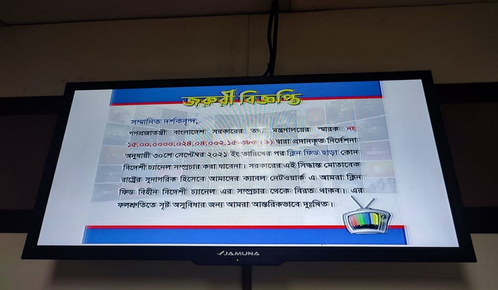 তথ্য ও সম্প্রচার মন্ত্রণালয়ের নির্দেশনা অনুযায়ী আজ থেকে থেকে ক্লিন ফিড (বিজ্ঞাপনমুক্ত) ছাড়া বিদেশি কোনো টিভি চ্যানেল দেশে সম্প্রচার চালাতে পারবে না। আজ থেকেই দেখা যাচ্ছে না বাংলাদেশে সম্প্রচারিত বিদেশি কোনো চ্যানেল। ইতোমধ্যে বিভিন্ন ক্যাবল অপারেটর চ্যানেলগুলোর সম্প্রচার বন্ধ করে নোটিশ দিয়েছে।