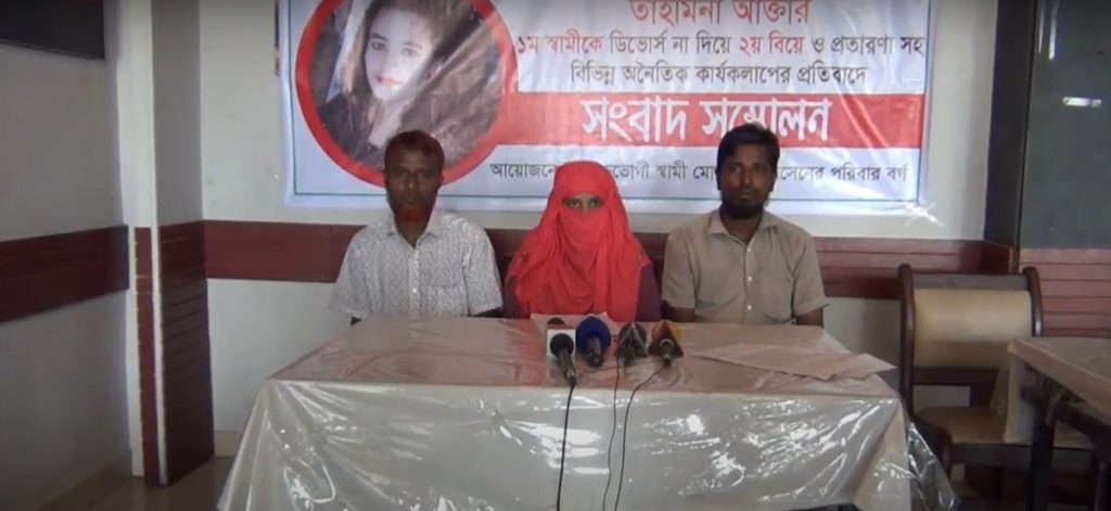 সংবাদ সম্মেলনে তার প্রথম স্বামী মোশারফ হোসেনের বোন ফারজানা আক্তার জানান, ২০০৬ সালে রায়পুরা উপজেলার আদিয়াবাদ শিকদারপাড়া এলাকার মৃত আব্দুল মন্নাফ মুন্সির মেয়ে তাহমিনা বেগমকে বিয়ে করেন সৌদি প্রবাসী মোশারফ হোসেন। বিয়ের পর থেকেই নানাভাবে সুকৌশলে নগদ অর্থ হাতিয়ে নেয়াসহ অনৈতিক সম্পর্কে জড়িয়ে পড়ে নেত্রী তাহমিনা।