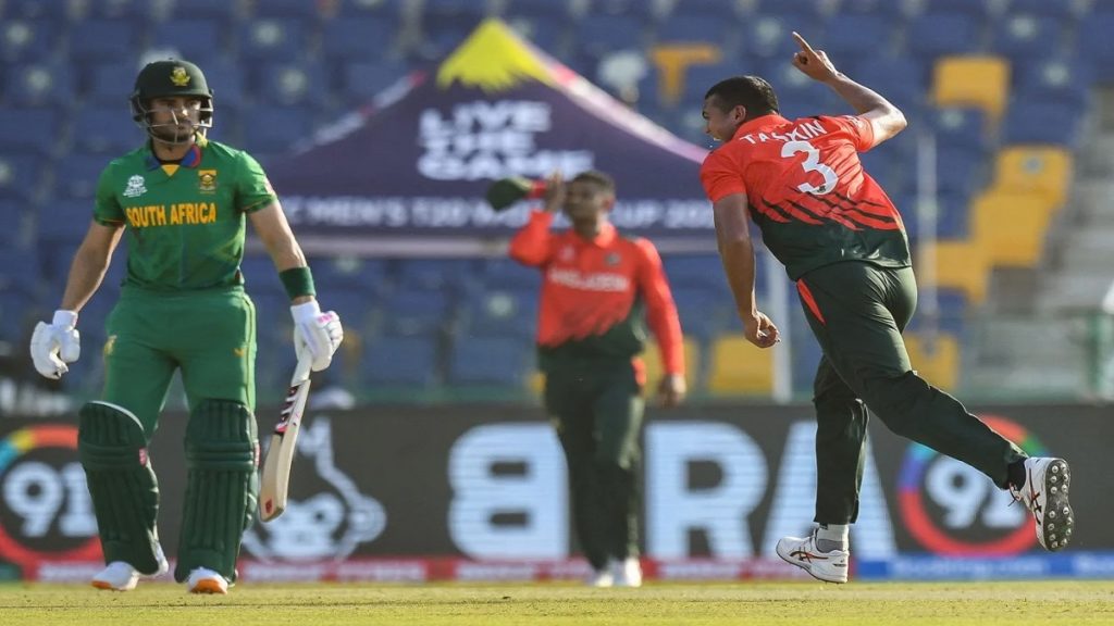 জবাবে ব্যাট করতে নেমে শুরুতেই ধাক্কা খায় প্রোটিয়ারা। ইনিংসের প্রথম ওভারেই তাসকিন তুলে নেন রিজা হেনড্রিক্সের উইকেট। আউটসাইড অফের বল রেজার ব্যাটকে ফাঁকি দিয়ে লাগে তার প্যাডে। আম্পায়ারও সাথে সাথে আঙ্গুল তুলে জানিয়ে দিলেন আউট।