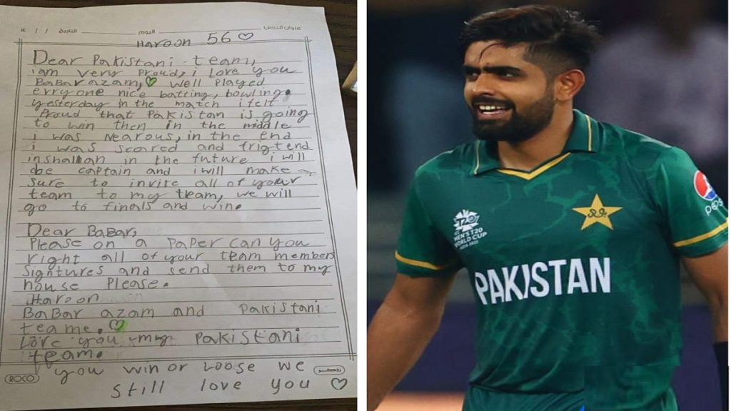 পাকিস্তান ক্রিকেট দল ও বাবর আজমকে উৎসাহ দিয়ে চিঠি লিখেছেন ৮ বছর বয়সী মোহাম্মদ হারুন সুরিয়া। চিঠিতে হারুন ভবিষ্যতে পাকিস্তান ক্রিকেট দলের অধিনায়ক হয়ে পাকিস্তানকে বিশ্ব চ্যাম্পিয়ন করবেন বলেও ইচ্ছা পোষণ করেছেন। এই চিঠি সামাজিক মাধ্যমে ইতিমধ্যে ব্যাপক সাড়া ফেলেছে।
