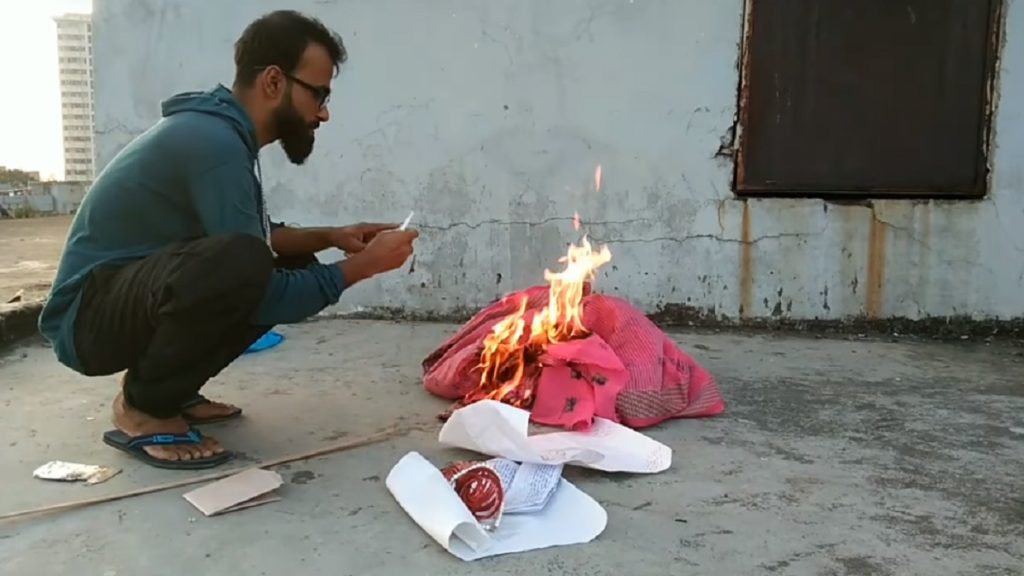 মো. শাহিন নামে ওই তরুণ সাবেক প্রেমিকার ফিরিয়ে দেয়া শাড়ি, চিঠি, চুড়ি ইত্যাদি পুড়িয়ে দেয়ার ওই ঘটনা ভিডিও করে ফেসবুকে আপলোড করেন। ভিডিওটি আপলোড করার পরপরই ভাইরাল হয়ে যায়। ভিডিওতে দেখা যায়, তরুণ শাড়ির আগুন থেকে সিগারেট জ্বালিয়ে ধূমপান করছেন।