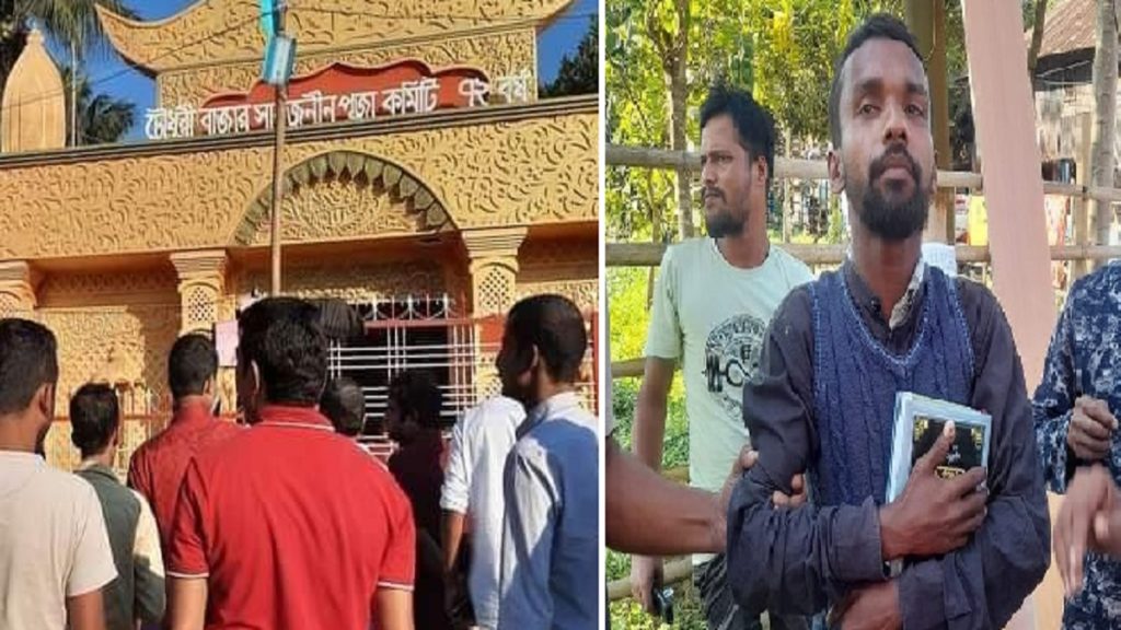 প্রত্যক্ষদর্শীরা জানায়, শুক্রবার দুপুর থেকে ওই যুবক চৌধুরী বাজার সার্বজনীন পূজা মণ্ডপের আশপাশ ঘোরাফেরা করছিল। এ সময় সেখানকার কয়েকজন লোক সন্দেহজনকভাবে তাকে নজরে রাখে। এক পর্যায়ে ওই যুবক মণ্ডপের পেছন দিকে গেলে স্থানীয় লোকজন তাকে আটক করে। এ সময় তার কাছে থাকা একটি ব্যাগে পবিত্র কোরআন শরীফ পাওয়া যায়।